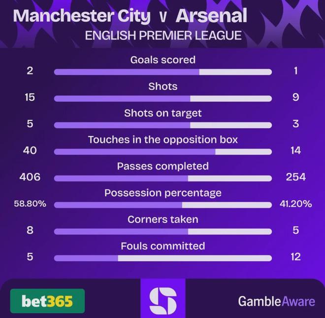很明显曼城在所有关键数据上均领先阿森纳,所以你说这场有遗憾吧,确实有,埃泽、哈弗茨、加布都有改写比分的机会,但总的来说曼城赢得也没任何问题,而且人家也2次打中立柱,多次浪费了机会。我认为曼城是靠实力赢下了这场比赛。