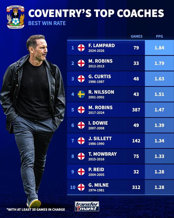 2024年11月,兰帕德接手考文垂,带队从第17名打到第5名,止步升级附加赛半决赛。本赛季,兰帕德带队高歌猛进,最终提前锁定了英超席位。根据统计,他的场均积分达到了1.84分,为队史最高。