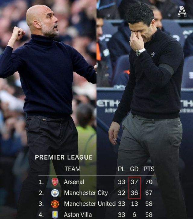 此役过后,曼城少赛1场积67分距榜首仅3分,阿森纳70分领跑却遭遇联赛两连败,英超争冠格局彻底改写。因为阿森纳目前的净胜球为37球,曼城36球,所以两队随后同积分,阿森纳也可能被对手反超失去榜首的位置。
