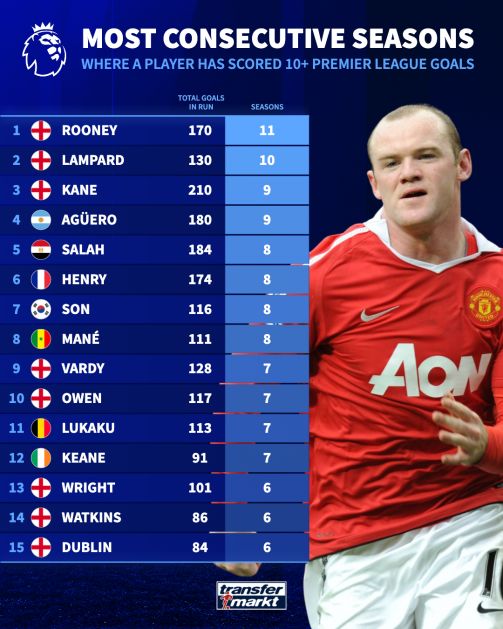 领跑的正是鲁尼。这位英格兰人在2004/05赛季到2014/15赛季之间,连续11个赛季英超进球上双,期间共打入170球。