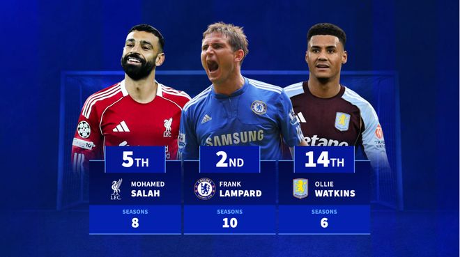 还有四名球员做到了连续7个赛季:瓦尔迪(128球)、欧文(117球)、卢卡库(113球)和罗比·基恩(91球)。