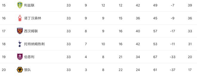 目前他们落后倒数第4位的西汉姆联多达16分,理论上的保级希望都已经不存在。