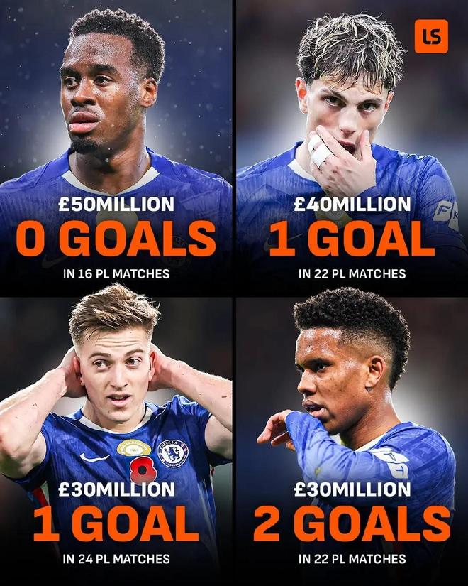 据统计,切尔西去年夏窗到队的四名前锋吉滕斯、加纳乔、德拉普和埃斯特旺一共只打入了4粒联赛进球,效率堪忧。