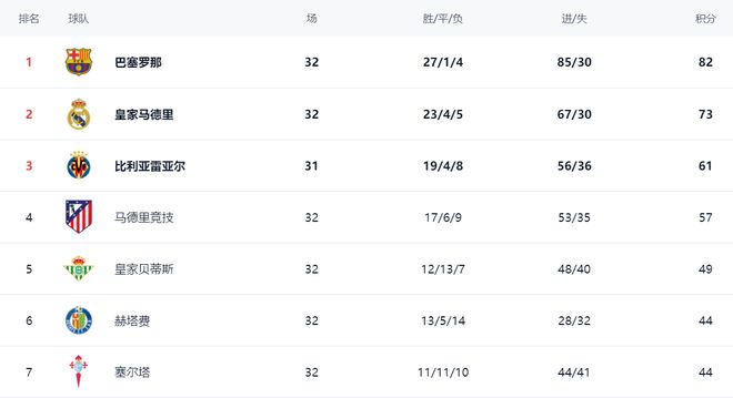 在积分榜上,巴萨以27胜1平4负的战绩排名榜首,拿到了82分。而皇马的战绩是23胜4平5负,只拿到73分,排名第2,落后巴萨9分,争冠希望比较渺茫。比利亚雷亚尔拿到61分,排名第3。输球的马竞依然是57分,排名第4。第5的是皇家贝蒂斯,拿到49分。赫塔费和塞尔塔都是44分,排名第6名和第7名。