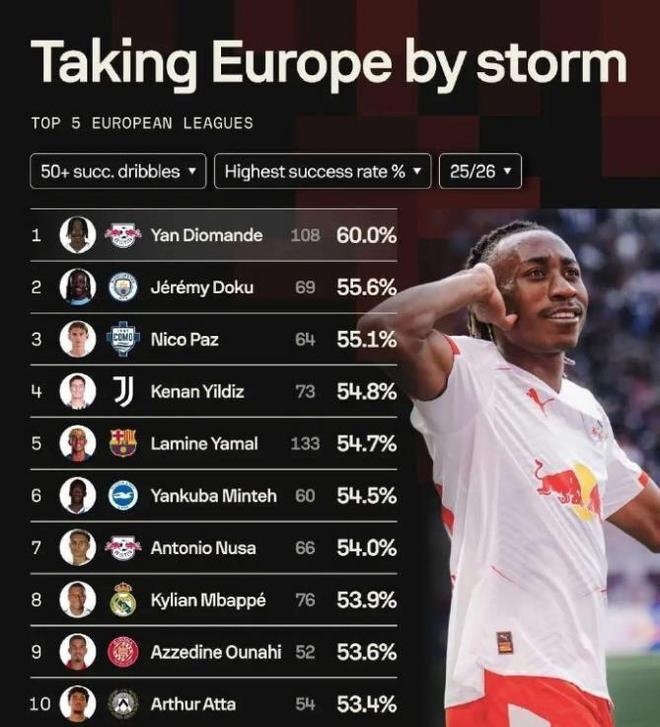 作为德甲赛场的过人王,扬迪奥曼德还有一项数据笑傲五大联赛。那就是在本赛季五大联赛中,成功带球突破50 次的球员里,这位19岁的科特迪瓦少年的突破成功率是最高的一位。成功率达到60%,力压曼城边锋多库的55.6%以及本赛季在意甲大杀四方的尼科帕斯的55.1%。