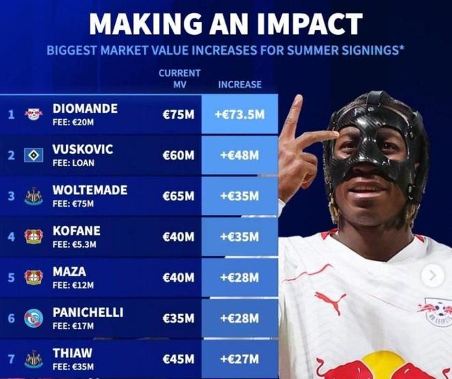 而如今,根据德国转会市场最新身价数据显示,扬迪奥曼德的身价已经暴涨至7500万欧元,仅仅一个赛季,净资产增值五倍。在德转列出的25/26赛季身价涨幅榜上,迪奥曼德以7350万欧元的夸张数据,成为本赛季世界足坛身价涨幅最高的球员。