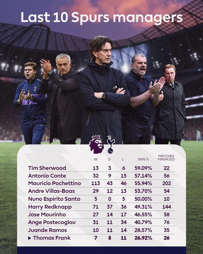 弗兰克曾谈及执教布伦特福德期间热刺炒掉了5名教练,强调自己从未被炒,不想一语成谶。英媒普遍认为弗兰克执教热刺,对双方都是风险极大的赌博,最终也毫不意外地失败。他的前任波斯特科格鲁带队拿到欧联杯冠军也未保住帅位,导致大多数热刺球迷始终对弗兰克抱有抵触情绪,对他的资历和执教方法都缺乏信心。