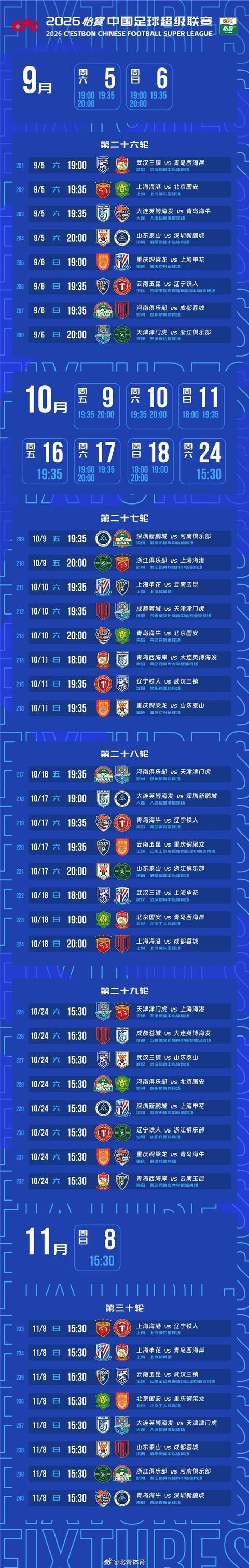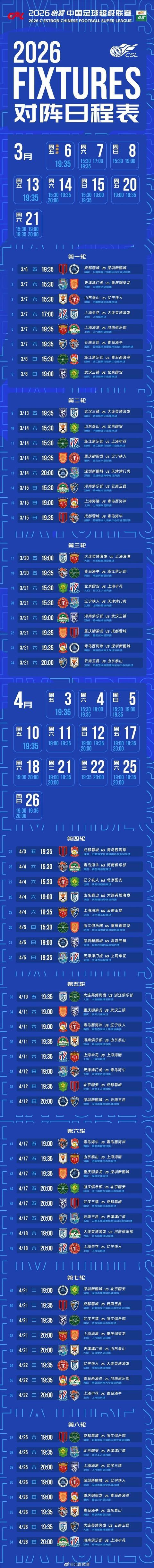 同样值得关注的是,2026赛季中超联赛仅有3轮安排了周中赛,分别是第7轮(4月21日、22日)、第10轮(5月5日、6日)、第13轮(5月19日、20日)。如此安排的另一个重要原因,是海港、国安、申花将从下半年开始分别参加2026-2027赛季亚冠两级赛事(目前仅成都蓉城仅存晋级2025-2026赛季亚冠精英联赛淘汰赛的理论可能)。中足联在赛程安排方面要兼顾这几支球队国际赛事竞争利益,因而没有在联赛下半程安排周中赛。