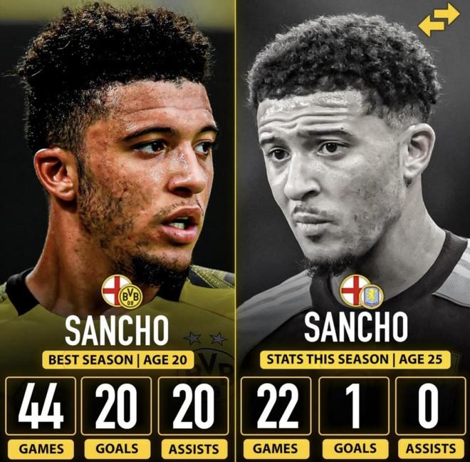 最近外媒整理了桑乔巅峰赛季与本赛季的对比数据。20岁那年他在多特几乎场场都能直接制造进球;而到了25岁,这一季踢了二十多场,进球和助攻却几乎停在原地。同样是边路球员,从“每场都有产出”到“很难留下关键数据”,落差大得有点不真实。到底是哪一段经历、哪一种场上变化,让他从巅峰变成了现在这样?(数据截至2026年2月7日)