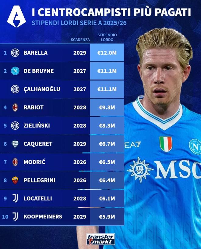北京时间2月20日,德转统计出了本赛季意甲税前年薪最高的10名中场球员,巴雷拉以1200万欧元排名第一,德布劳内和恰尔汗奥卢同以1110万欧元并列第二位。