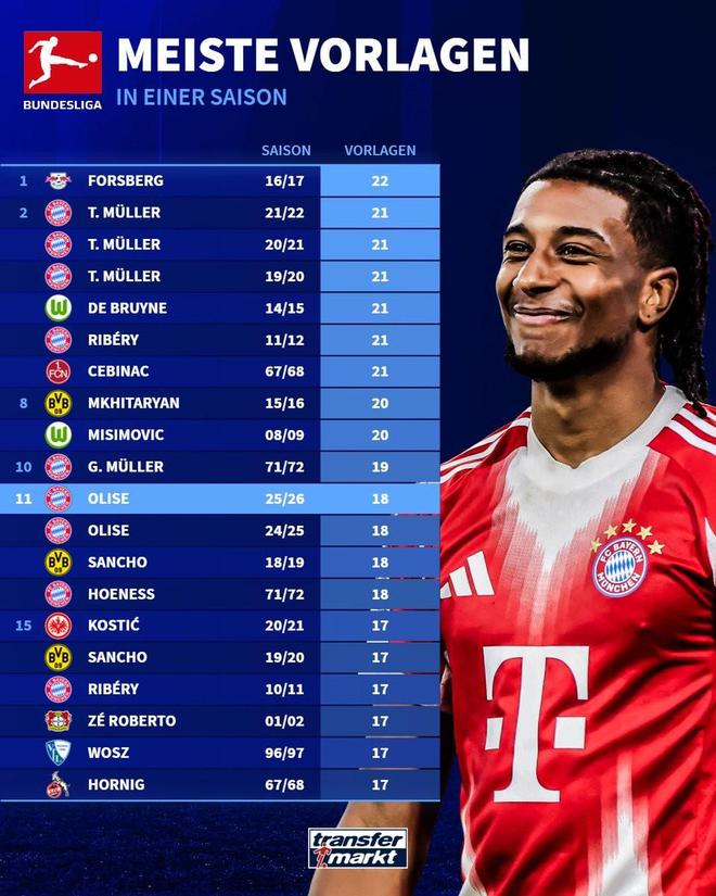 按照德转的统计,奥利塞本赛季德甲出场21次送出18次助攻,这一数据已经能够排在德甲历史单赛季助攻榜的并列第11位,目前这位法国球星距离福斯贝里保持的德甲单赛季22次助攻的纪录还差4次,在本赛季德甲还剩余12轮比赛的情况下,奥利塞很有希望打破这一纪录。