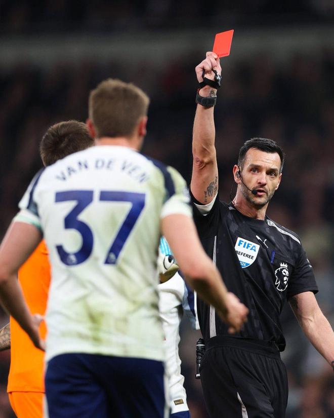 可仅仅过了4分钟,热刺后防突然崩盘。中卫范德芬在禁区内拉倒萨尔,主裁判毫不犹豫出示红牌并判罚点球。萨尔亲自站上点球点,一脚稳稳命中,水晶宫将比分扳成了1-1平手,双方又回到同一起跑线。