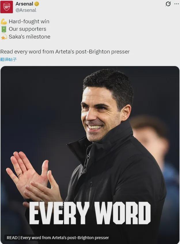 阿尔特塔出席了赛后新闻发布会,我们来简单看看阿森纳主帅的发言。