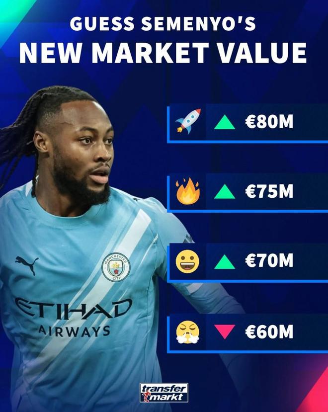 在德转3月9日将会更新英超球员身价的情况下,他们也对现有身价6500万欧元的塞门约进行了身价预热。