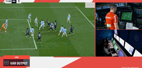 易边再战皇马的进攻还是难有成效,第63分钟,皇马右路推进,阿诺德跟进下底回传,皮塔奇点球点前迎球大力扫射被挡出。第71分钟,皇马右侧角球机会,尤特格拉解围非常明显的手球,主裁在观看VAR后却没有吹罚点球。补时最后1分钟,皇马左路快攻,维尼修斯带球推进回传中路,连续的转移,楚阿梅尼将球斜塞到右侧,阿诺德禁区边上接球晃开防守斜塞中路,贝西诺解围没有踢远,巴尔韦德禁区弧顶前将球拦下,往前跟进一步大力兜射,皮球击中防守球员折射入网,皇马2:1绝杀塞尔塔。