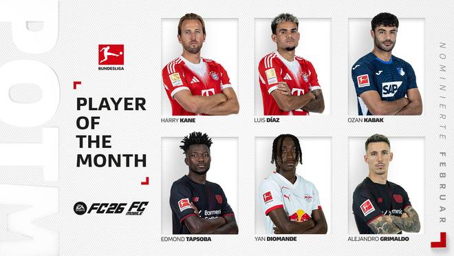 北京时间3月4日,德甲官方公布了德甲2月最佳球员候选,其中凯恩、迪亚斯领衔,扬-迪奥曼德、卡巴克、塔普索巴、格里马尔多在列。