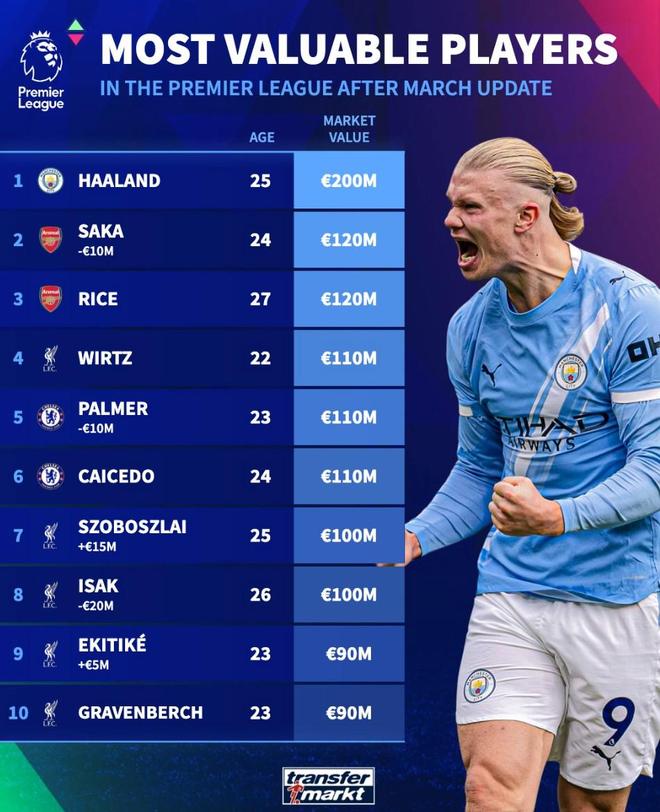 北京时间3月9日,在更新了英超球员的身价之后,德转还统计出了此次更新后英超身价最高的10名球员,哈兰德继续以2亿欧元高举第一,身价下跌1000万欧元的萨卡以1.2亿欧元与队友赖斯并列第二。