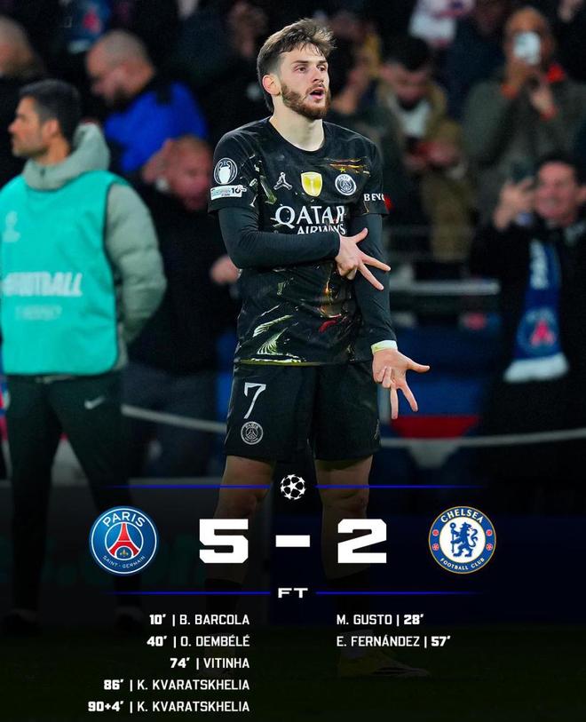 易边再战,第60分钟,内托左路突破后倒三角回传,恩佐跟进推射得手,切尔西将比分扳成2-2平手,双方又回到同一起跑线。就在很多人以为比赛会继续僵持时,恩里克大手一挥,克瓦拉茨赫利亚替补登场,这次神换人也为大胜埋下伏笔。
