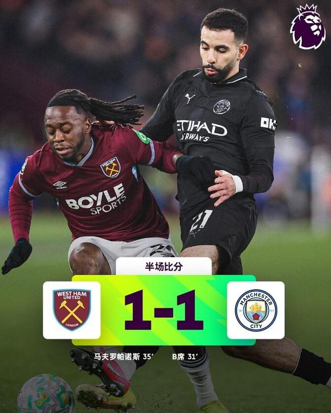 第32分钟曼城在中前场连续传递,马尔穆什送出直塞球,B席在小角度的情况下起脚挑射破门,曼城队1-0取得领先。第35分钟西汉姆联队角球开到禁区内,马夫罗帕诺斯头球攻门,皮球打在横梁下沿弹入球门,西汉姆联队1-1追平比分。