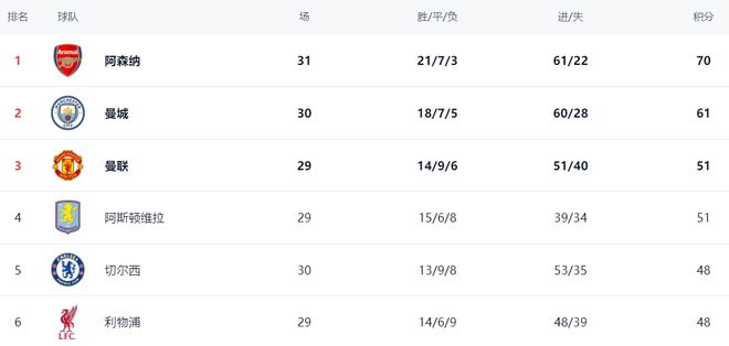 在积分榜上,阿森纳以70分高居榜首。曼城掉链子,总积分只有61分,排名第2。曼城落后9分之多。显然,英超冠军归属已经基本失去悬念。曼城争冠只存在理论上的可能性。曼联51分,排名第3。第4的阿斯顿维拉也是51分。切尔西输球,依然是48分,排名第5。利物浦比切尔西少赛一场,也是48分,排名第6。热刺只拿到29分,排名第16。