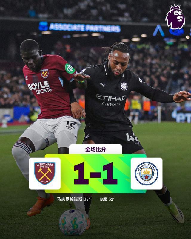 比赛余下时间,曼城对主队展开了围攻,但塞梅尼奥和哈兰德的射门不是打偏就是被门将神勇扑出,比赛尾段门框也挡出了赖因德斯似传似射的任意球。随着比赛最后时刻格伊在西汉姆禁区内大脚将球射歪,瓜迪奥拉只能仰天长叹,接受平局。