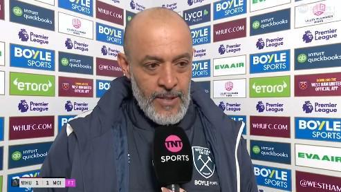 英超第30轮,西汉姆联主场1-1战平曼城,西汉姆联主帅努诺赛后接受了TNT体育的采访。