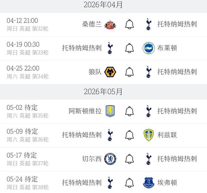 热刺本赛季英超剩余赛程(北京时间)